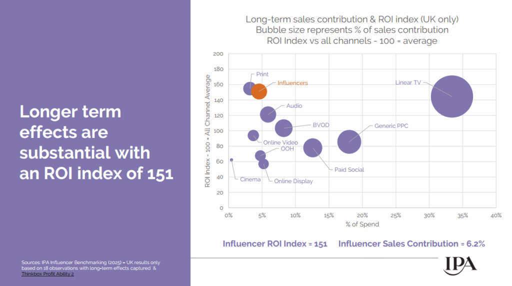 Of all the insights shared at the IPA Effectiveness Conference, one slide has dominated LinkedIn: a chart showing the long-term effectiveness of influencers. When read correctly, it suggests influencers deliver above-average ROI, outperforming even TV. Exciting news for anyone championing influencer marketing, but several important caveats were made clear at the conference that are getting lost in the online buzz.