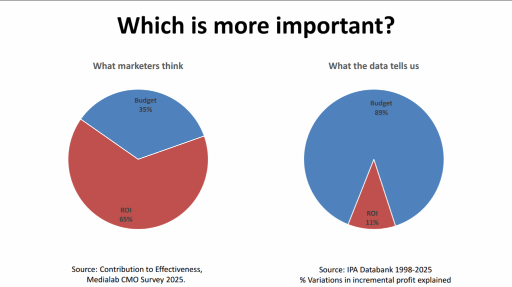 The latest work from Effectiveness guru Les Binet focuses on the importance of actually putting budget behind advertising. As an industry, we often talk about the power of really strong creative or the importance of having the right media plan. And if you really are working with a set budget, these are two key levers you have control over. But perhaps as the chart shows, CMOs on average now view the creative or media choices as being as important as how much they spend.