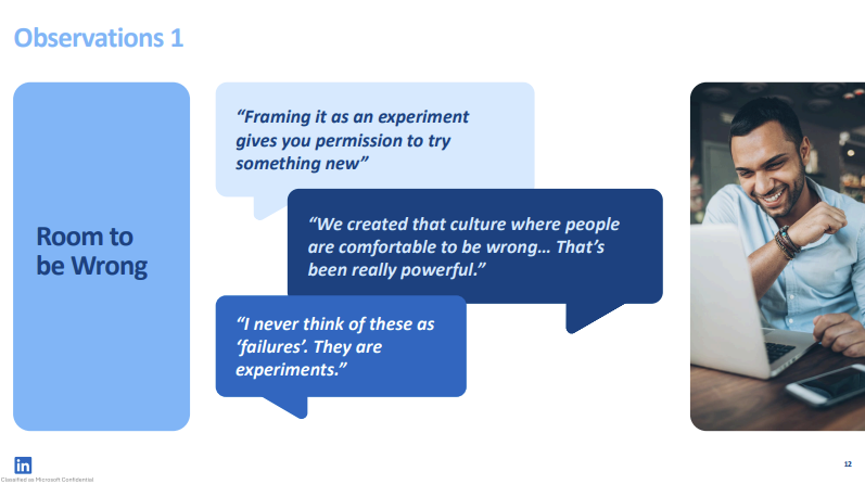 Room to be wrong: Always remember that not everything works, and that’s OK! When you refer to an idea you’re trying as an experiment, it makes it clear that it might succeed or fail, and you’ll improve in the future based on the results.